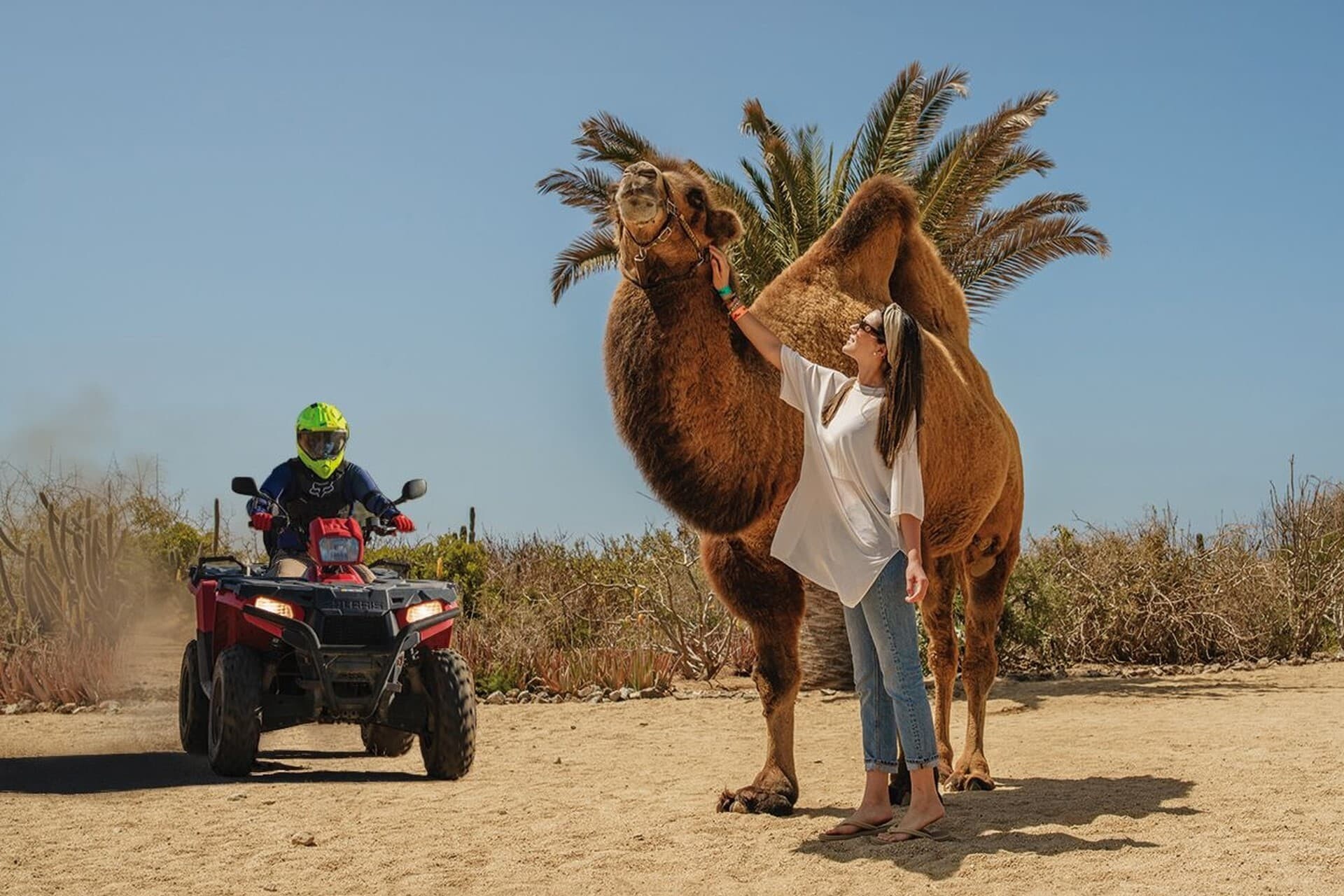 Experience three of Cabo Adventures top tours in one day and uniquely discover the Baja outback! Start your adventure with a visit to one of our unique environmentally friendly workshops at Ecofarm, a series of interactive experiences surrounding sustainability and conservation. Ride along the Cabo desert and enjoy the sights and crashing waves of the Pacific Ocean atop a charming camel. Take a quick stop to meet our friendly camels and pose for a close-up photo. Continue your adventure, exploring the Baja desert on a modern automatic ATV vehicle accompanied by our experienced guides.